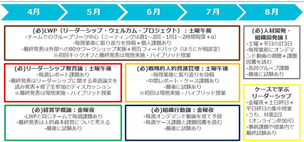 4月に入学してから半年間のスケジュールは下記の通りです。授業は金曜日の18時半~21時55分までと、土曜日の朝8時50分~17時までとなっています。金曜日の授業は基本的にオンラインですが、土曜日はリアルとオンラインミックスのハイブリッド形式で授業が行われることもありました。