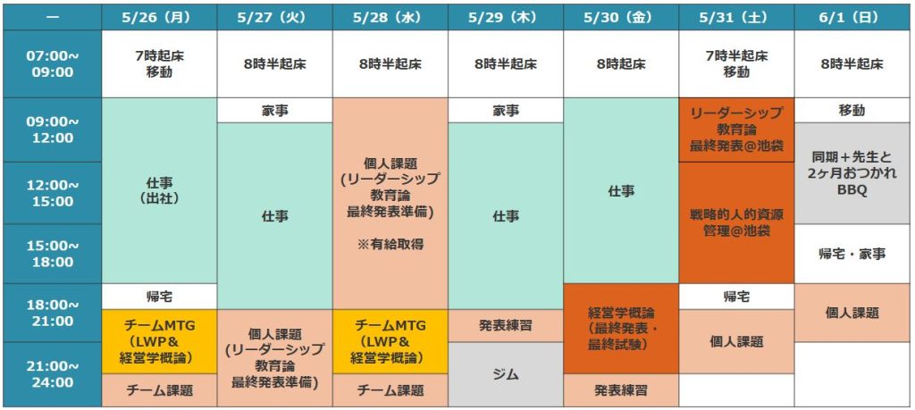 「春学期で一番忙しかった5月末の一週間です。ちょうど授業の切り替えのタイミングで、前の授業の試験や課題、発表の準備などが重なってしまったため、有給を取って対応しました。ご覧になって分かる通り、私は超夜型です。お客様対応で出社することはありますが、基本的にフルフレックス、フルリモート勤務ということで、LDCの課題やミーティングは夜の時間帯にやっています。試験や課題提出、発表などを乗り越え、日曜日は同期や先生とBBQに行くなど、遊びも楽しみながら過ごした1週間でした」
