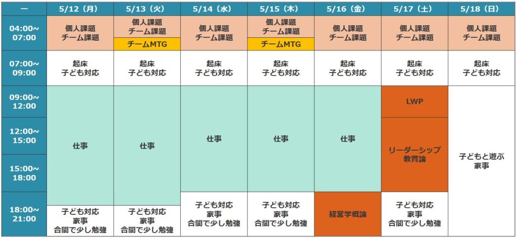 <1年次春学期のある1週間(フルタイム勤務・子育て中)の例>
