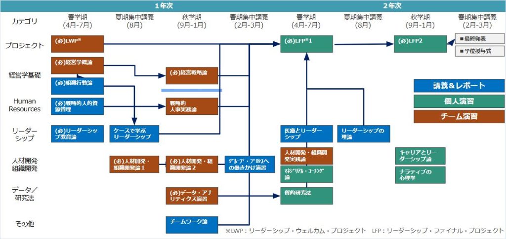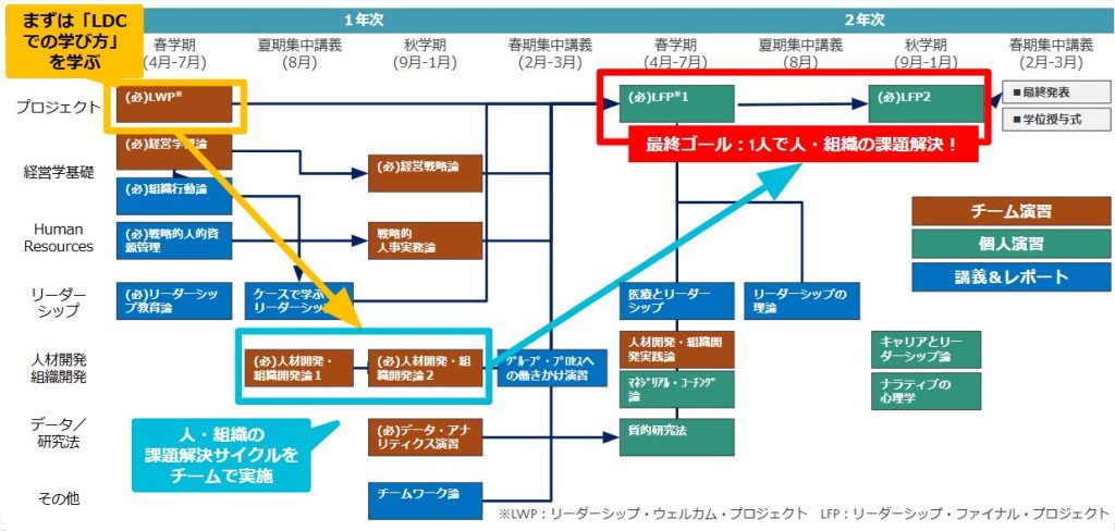 入学後はどのような日々が待っているのでしょうか。LDCのカリキュラムはほとんどが必修の授業で構成されています。下記は今年度の年間スケジュールを「チーム演習」「個人演習」「講義&レポート」という3種類の授業形態別に色分けしたものです。このように見ていくと、1年次の方が授業数も多く、特にグループワークでおこなう「チーム演習」が多いこと、2年次には修士論文にあたるリーダーシップ・ファイナル・プロジェクトが中心となり「個人演習」が多くなっているということが分かります。また、人材開発・組織開発・リーダーシップ開発の大学院ということで、この領域に特化した授業が多い、ということも見て取れます。