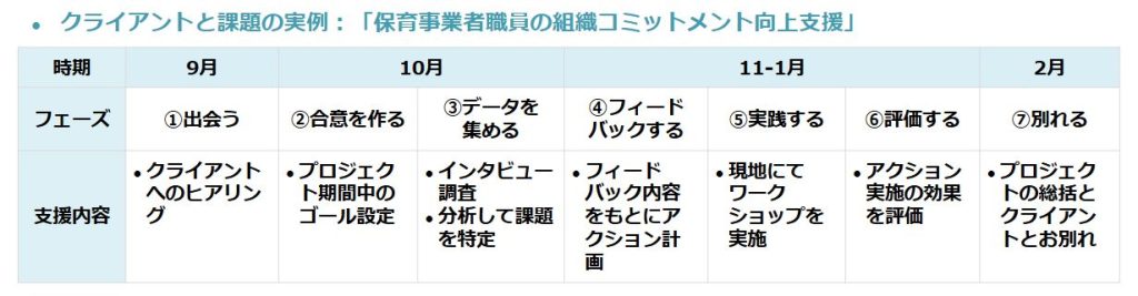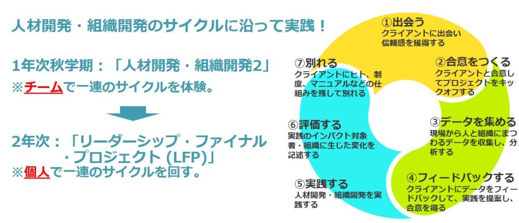 この2回のクライアントワーク型のプロジェクト演習では、教室を飛び出し、リアルな現場で人材開発・組織開発のサイクルに沿って人と組織の課題解決の実践をしていきます。このプロジェクト演習こそが「理論と実践の往還」であり、これまで学んできたアカデミックな知見を生々しい現場でどう生かせるか、試行錯誤しながら取り組んで行きます。