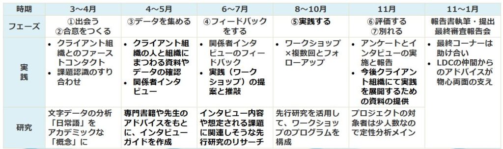 - 手法 書籍・論文での裏付け、外部調査・インタビュー + 同期・講師からのフィードバック