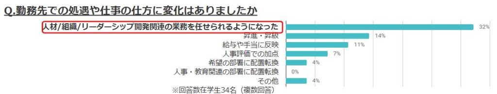LDCの学びはキャリアにどのような影響を与えているのでしょうか? LDCの在学生34名への調査によると、LDCで学びはじめたことで、32%の人が「人材・組織・リーダーシップ開発関連の業務を任せられるようになった」と答えています。LDCで学んでいることが評価され、人材開発部門へ異動になった、組織開発の仕事を任されるようになった、という人が多いようです。また、14%が「昇進・昇級そして昇給した」と答えており、キャリアにプラスに働いていることは明らかです。